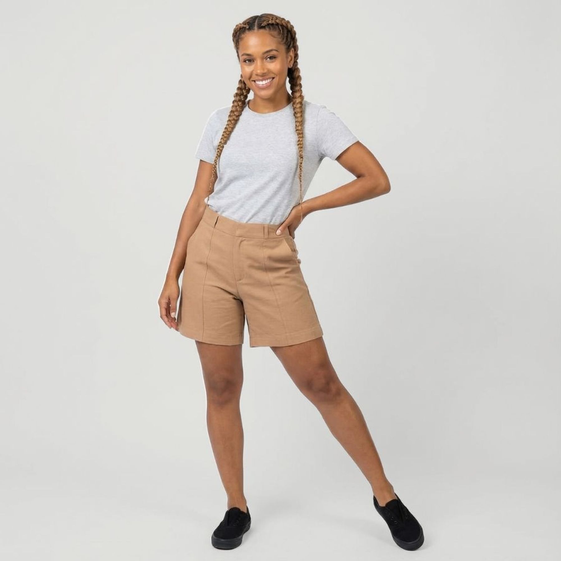 Economia de R$ 37,00Bermuda feminina de visual minimalista, em tom cor de pele, ideal para composições versáteis. A modelagem mais ampla com cintura alta e pences frontais valoriza o caimento, enquanto os bolsos tipo faca trazem praticidade. Confeccionada em tecido leve com predominância de viscose, é uma peça curinga para diferentes ocasiões.