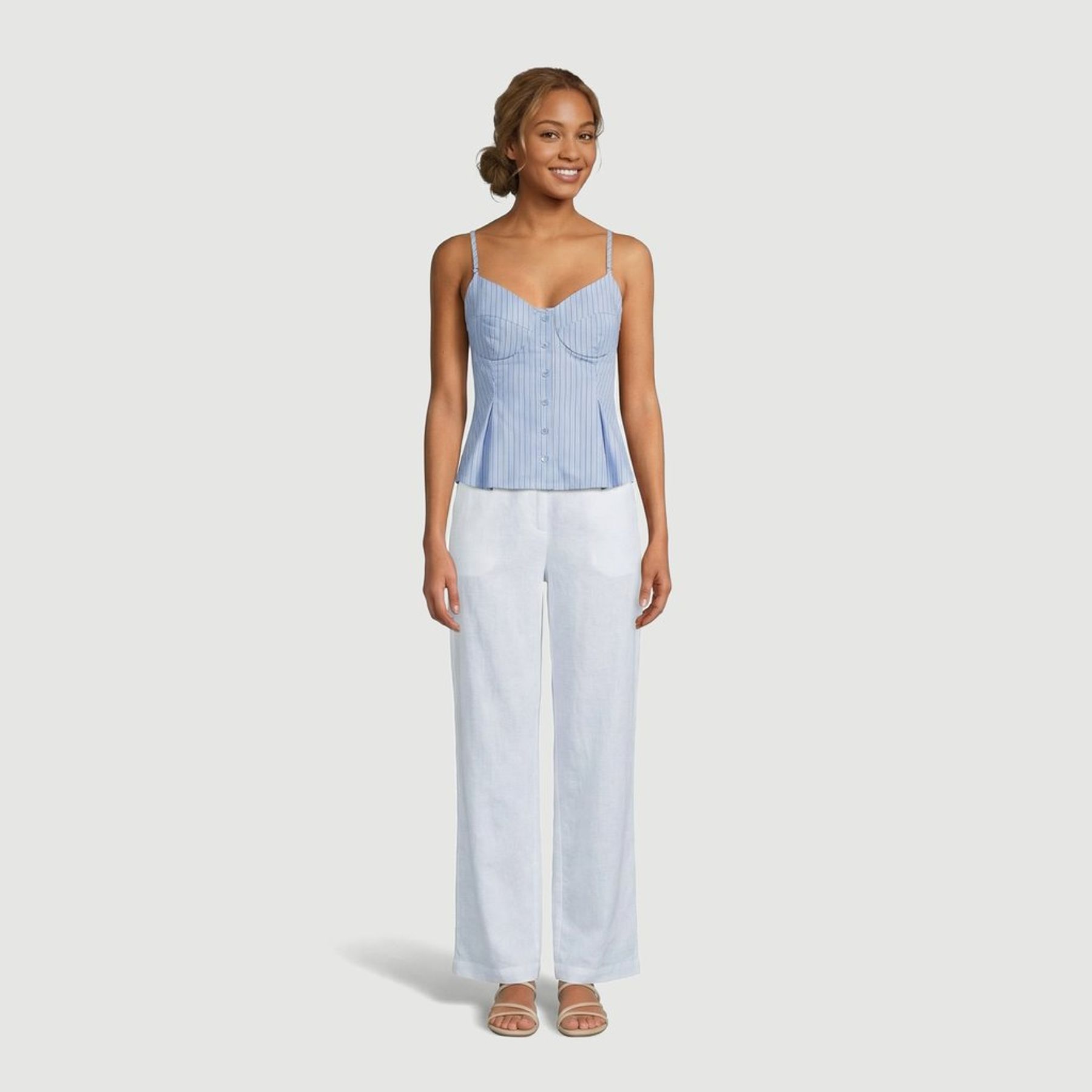 O modelo conta com alças finas reguláveis, decote coração e recorte estilo corset com bojo, criando uma proposta mais estruturada. O fechamento frontal por botões e a modelagem ajustada com leve evasê na barra finalizam o design, combinando bem com jeans, saias e peças de alfaiataria.