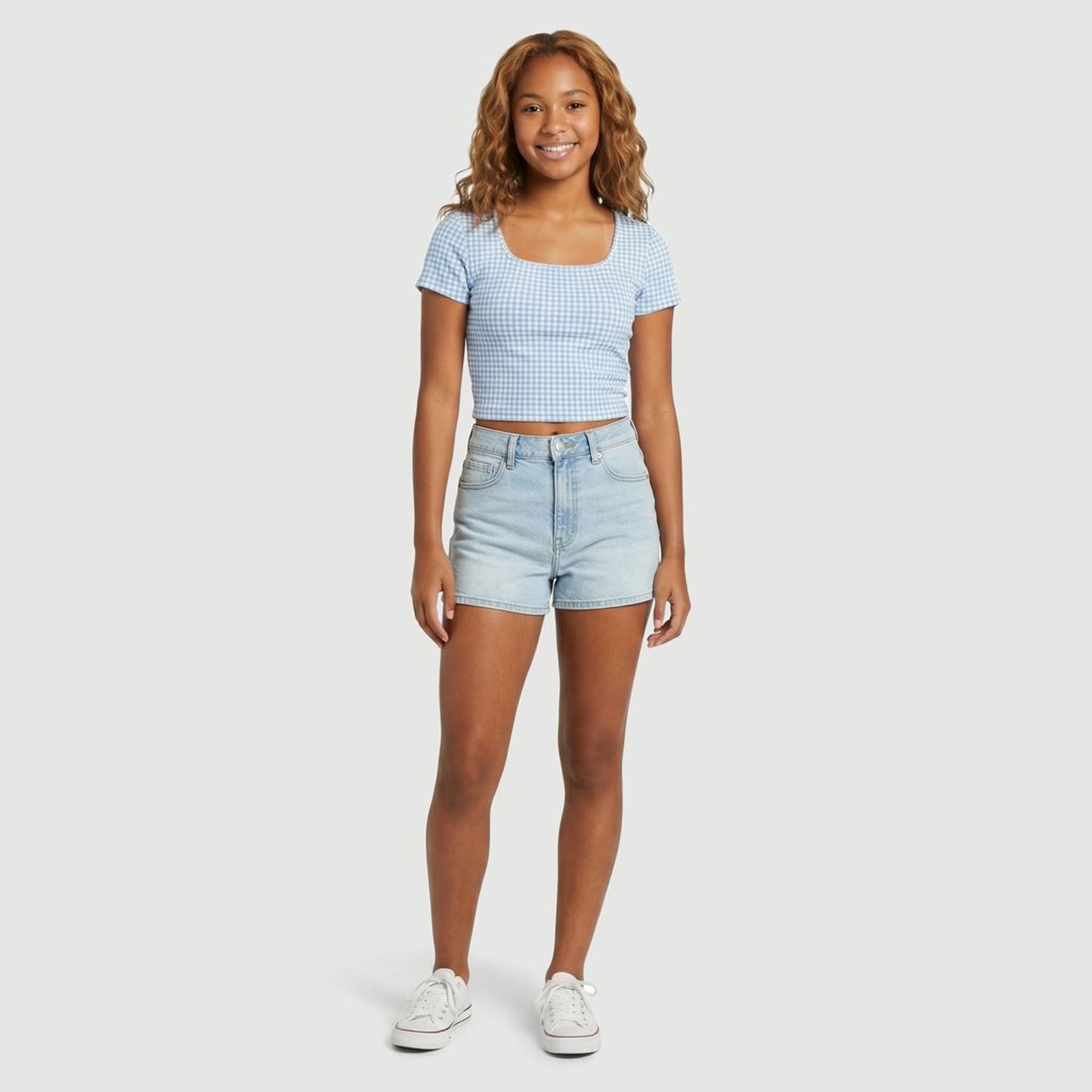 Economia de R$ 24,00A blusa feminina cropped Love Trend é uma opção moderna para compor produções leves. A estampa xadrez vichy em azul traz um visual jovem e fácil de combinar com jeans, saias e peças de cintura alta.