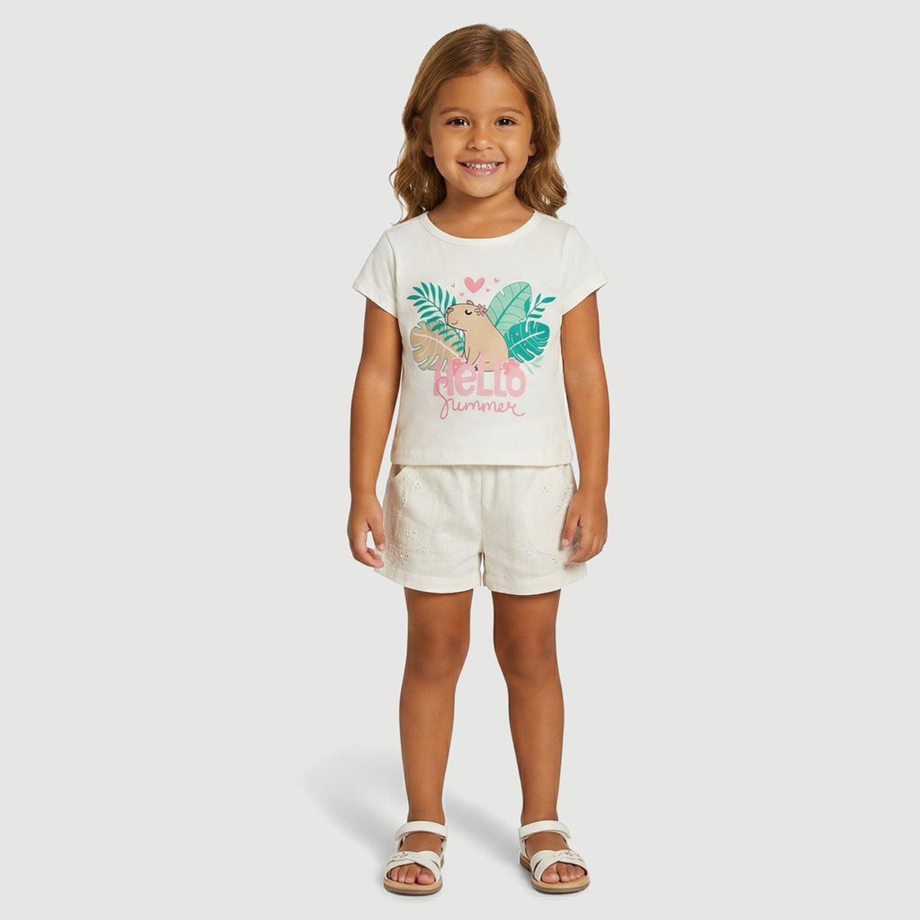 Na cor creme, traz estampa frontal com capivara estilizada, folhagens tropicais e a frase “Hello Summer”, criando um visual leve com tema de verão. O modelo conta com gola redonda e mangas curtas, combinando facilmente com shorts, saias e calças.
