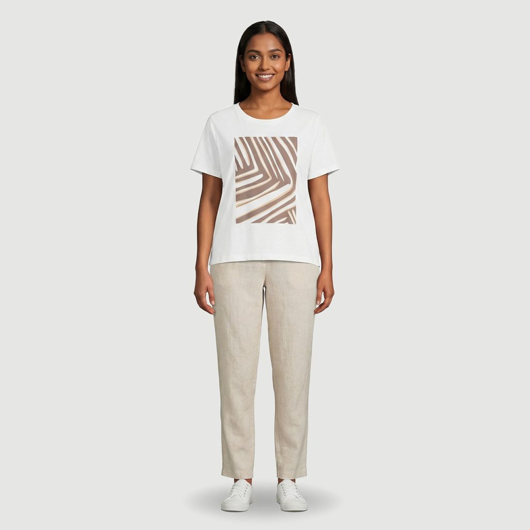 A estampa geométrica frontal centralizada em formato retangular, com linhas curvas em padrão abstrato, acrescenta personalidade na medida certa. Combine com jeans, shorts ou saias para diferentes propostas do cotidiano.