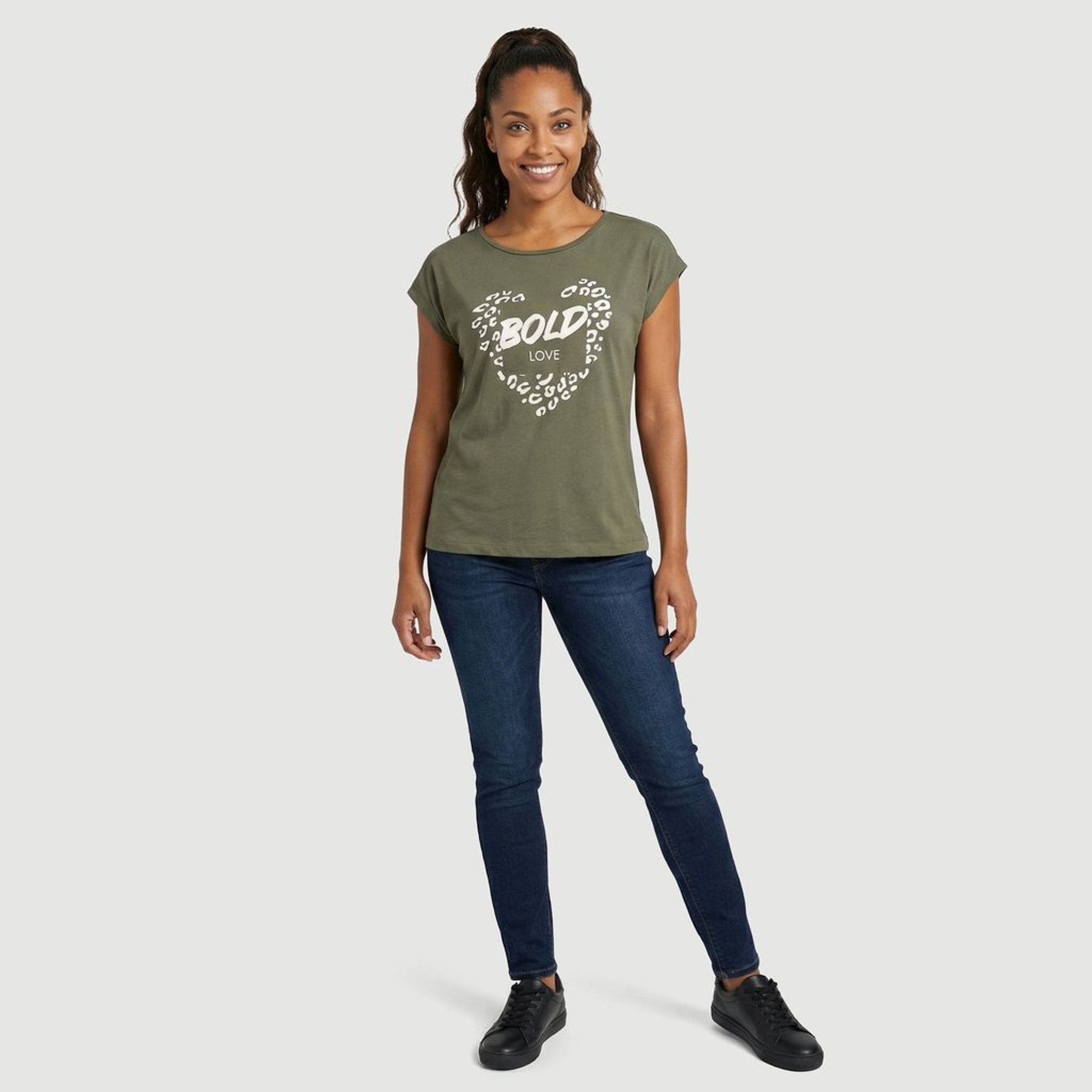 A estampa frontal centralizada em contraste destaca a frase “BOLD LOVE” com um coração formado por manchas em estilo animal print, adicionando um toque marcante ao look.