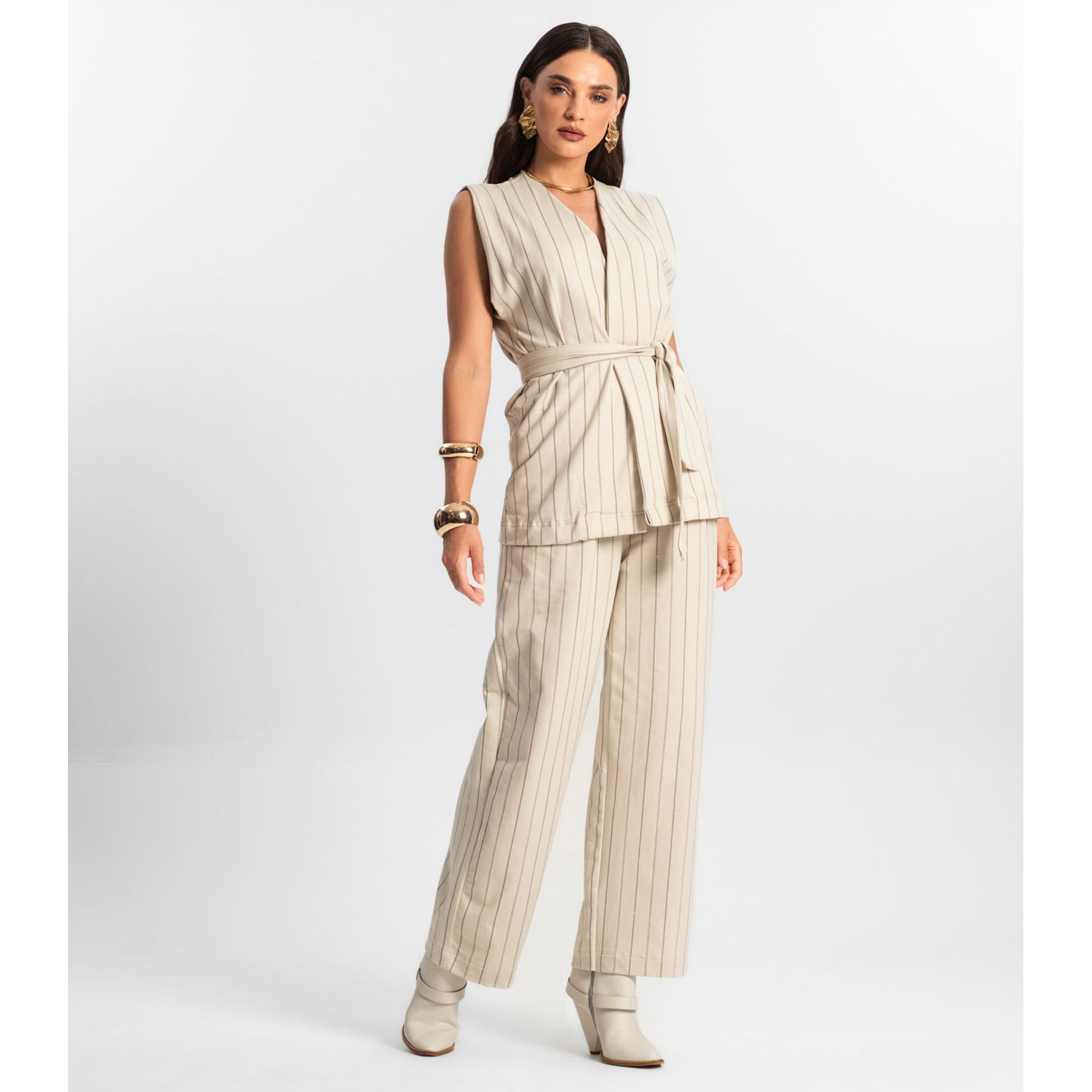 Calça pantalona cintura alta geométrica bege - Viva Plus