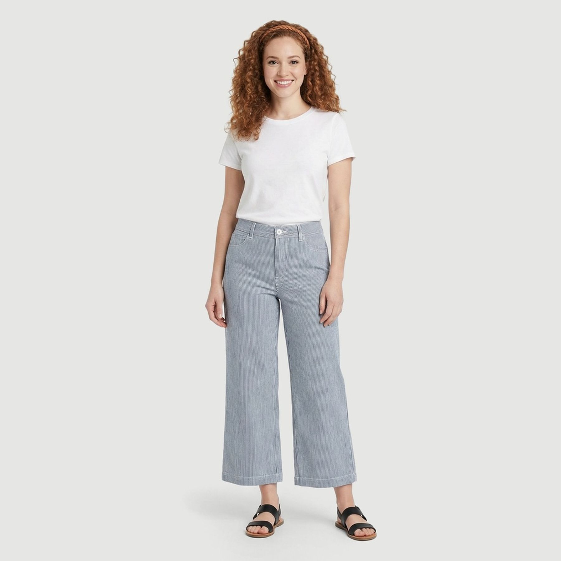Com modelagem wide slim, perna reta/ampla e comprimento cropped, oferece um caimento moderno. Possui cós com passantes, fechamento frontal por botão, bolsos frontais e barra reta, ideal para usar com tênis, sandálias ou botas.
