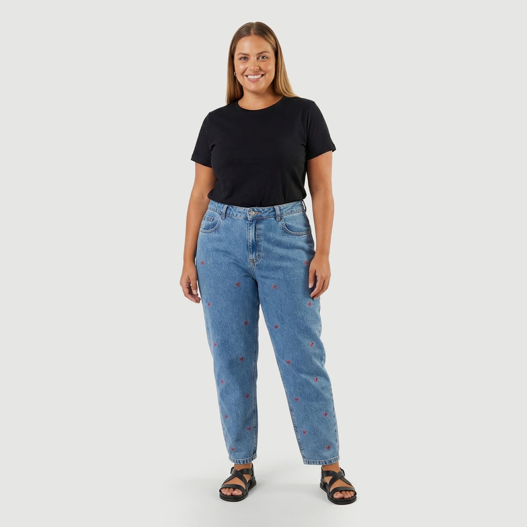 Economia de R$ 38,50A calça jeans feminina Ink modelo mom é ideal para compor looks práticos com um toque delicado. Em jeans com lavagem azul média, traz bordados de corações em vermelho espalhados pela peça, adicionando charme ao visual.