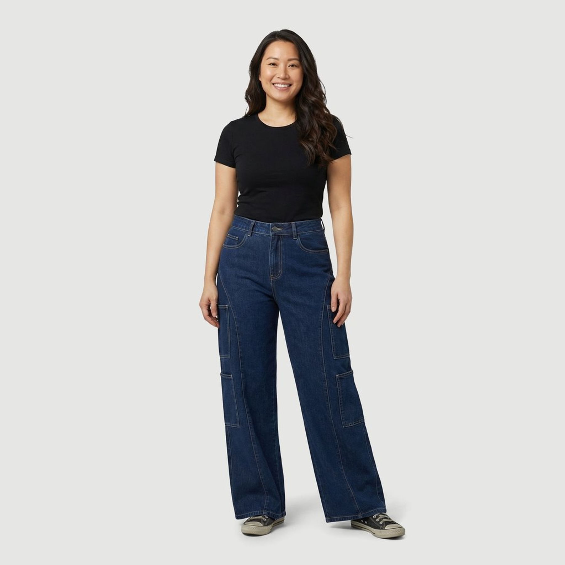 Economia de R$ 55,00A calça jeans feminina Sawary wide leg é ideal para compor produções modernas e versáteis. Em jeans liso azul escuro, traz proposta utilitária com bolsos cargos laterais e recortes com costura contrastante que destacam o design.