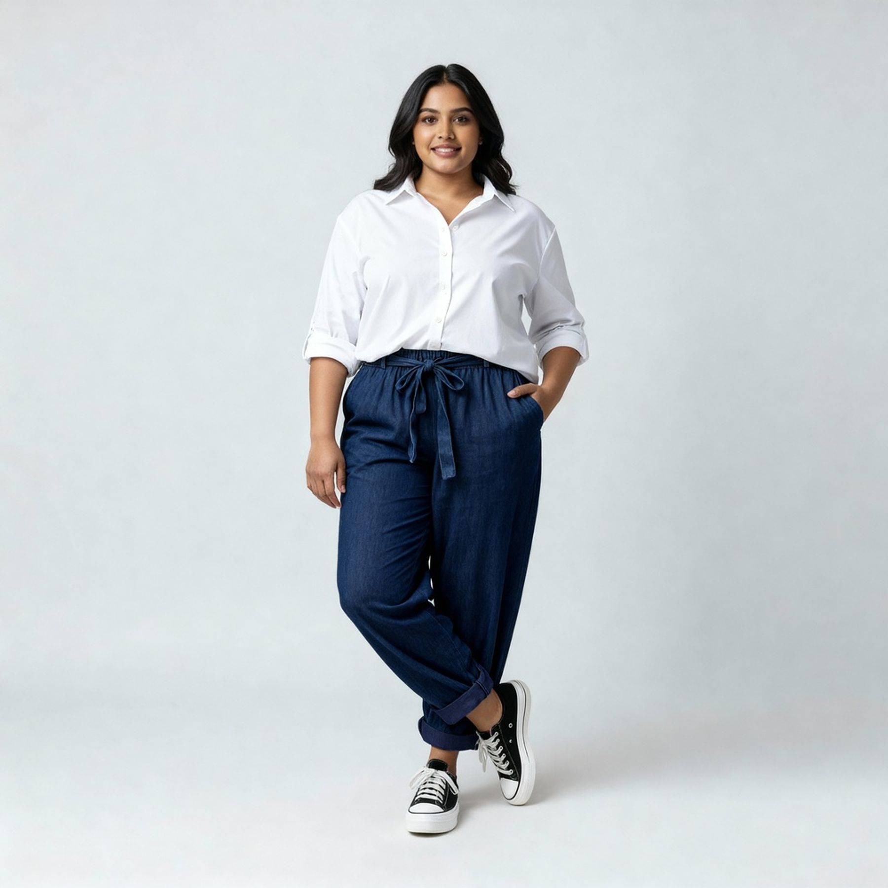 Economia de R$ 15,00Calça feminina de sarja jogger alfaiatada, confeccionada em tecido confortável no tom azul marinho. Possui faixa para amarração na cintura e modelagem que une o caimento sofisticado da alfaiataria com o conforto da jogger. Versátil e moderna, é ideal para looks casuais ou sociais elegantes.