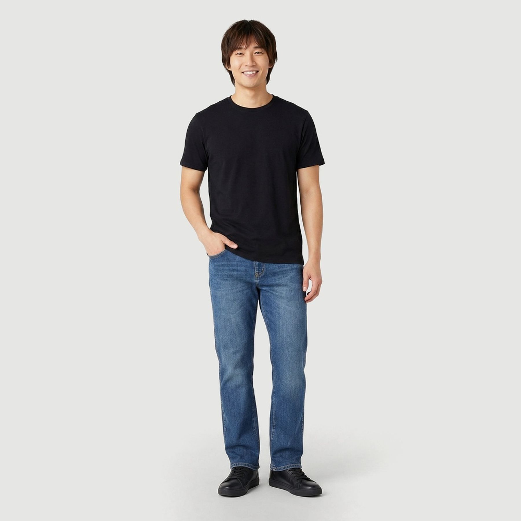 Com visual liso e lavagem azul médio estonada com leve efeito used, entrega um acabamento moderno sem perder a proposta tradicional. A modelagem regular/reta combina bem com camiseta, camisa ou jaqueta.