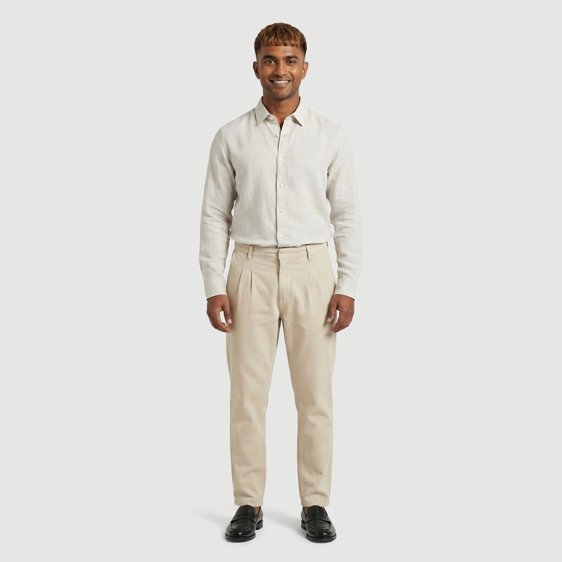O modelo possui pregas frontais, bolsos laterais e fechamento frontal com vista coberta, que deixa o visual mais limpo. O cós com passantes permite o uso com cinto e a modelagem afunilada ajuda a criar um caimento moderno e alinhado.