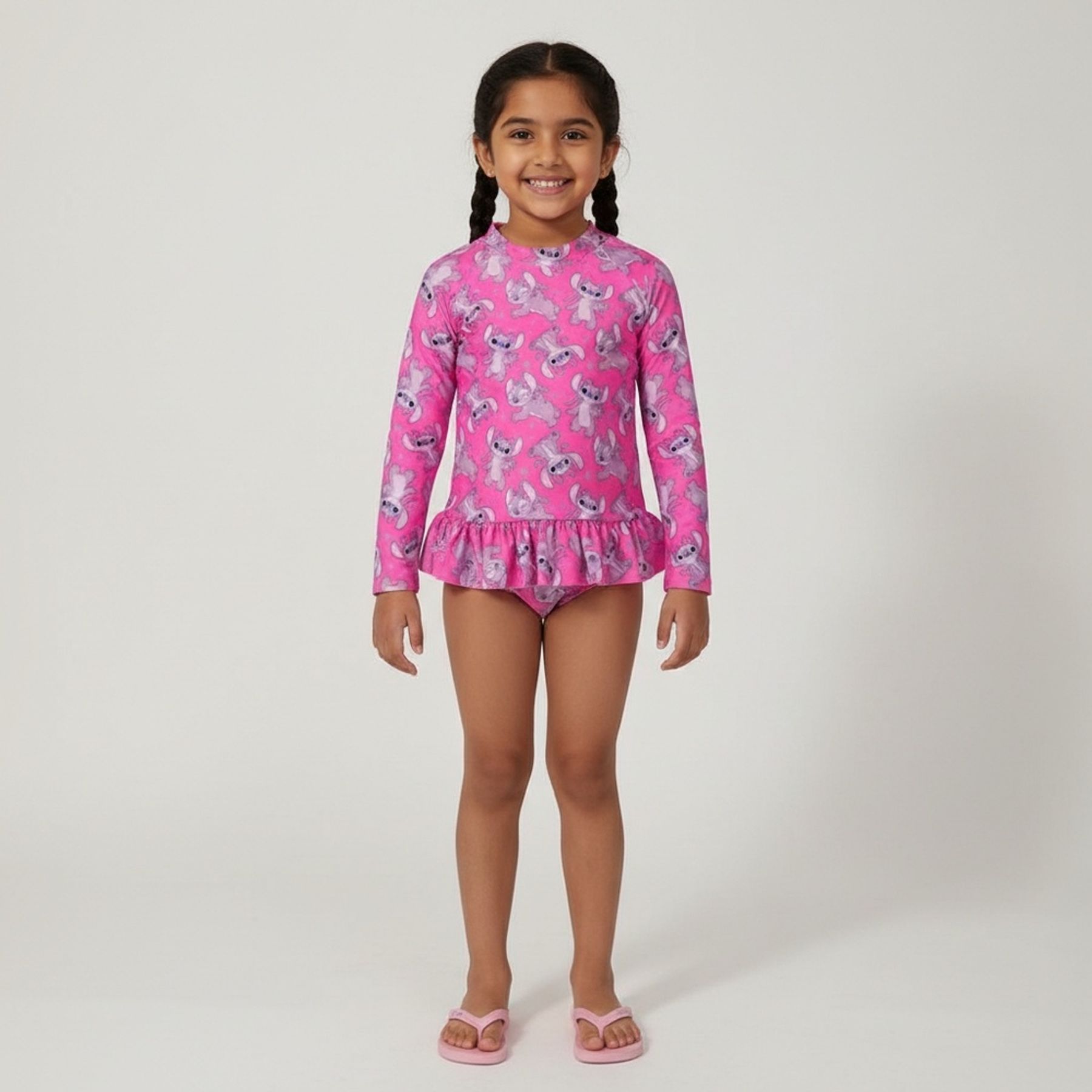 Economia de R$ 7,00Conjunto infantil Disney com blusa de manga longa e calcinha combinando, ideal para momentos de lazer e passeios. A blusa tem gola redonda e babado na barra, e a estampa corrida do Stitch aparece em fundo rosa com detalhes em lilás, criando um visual delicado e divertido. Confeccionado em tecido sintético 100% poliéster. Itens inclusos: 01 blusa e 01 calcinha.