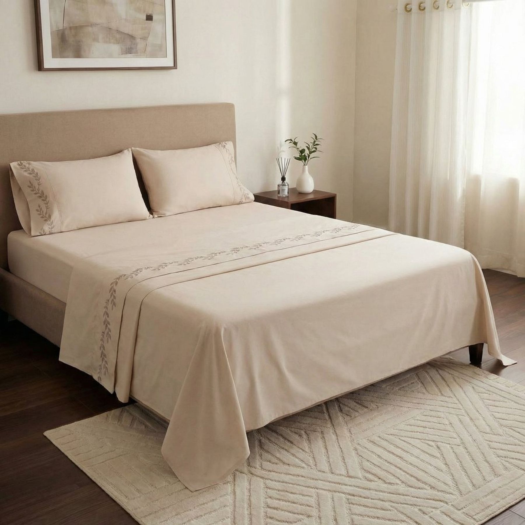 Economia de R$ 20,00O jogo de cama queen 4 peças Pernambucanas Casa é ideal para renovar o quarto com um visual elegante. O conjunto traz bordado de folhagens que cria moldura nas fronhas e uma faixa decorativa na parte superior do cobre-leito/edredom, valorizando a composição. Em tom bege, combina facilmente com decorações claras e ambientes neutros. Confeccionado em 100% poliéster, tem toque macio e acabamento uniforme.