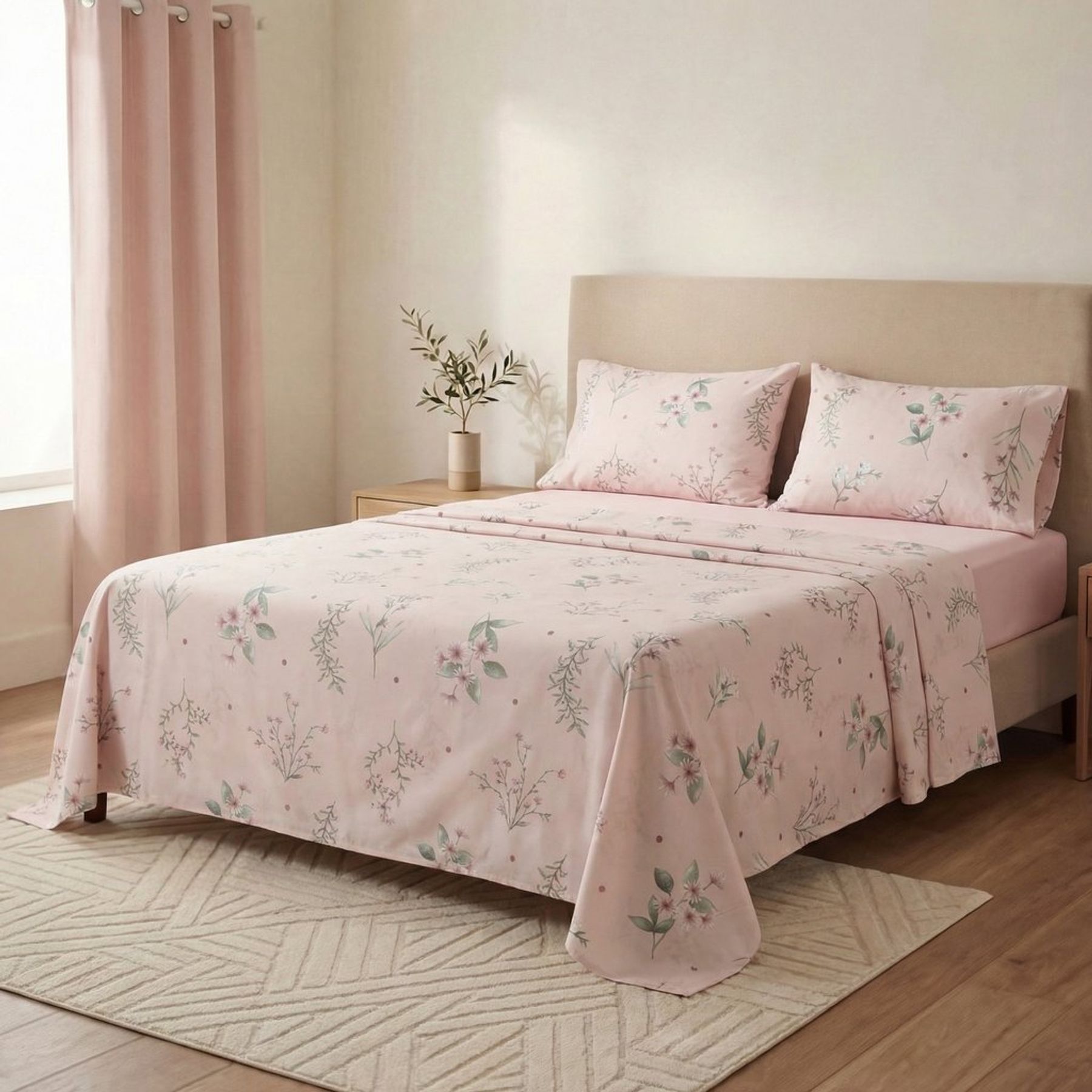 Confeccionado em micropercal 100% poliéster, oferece praticidade na rotina e compõe a cama com peças estampadas e uma peça lisa em rosa claro, criando uma decoração suave.