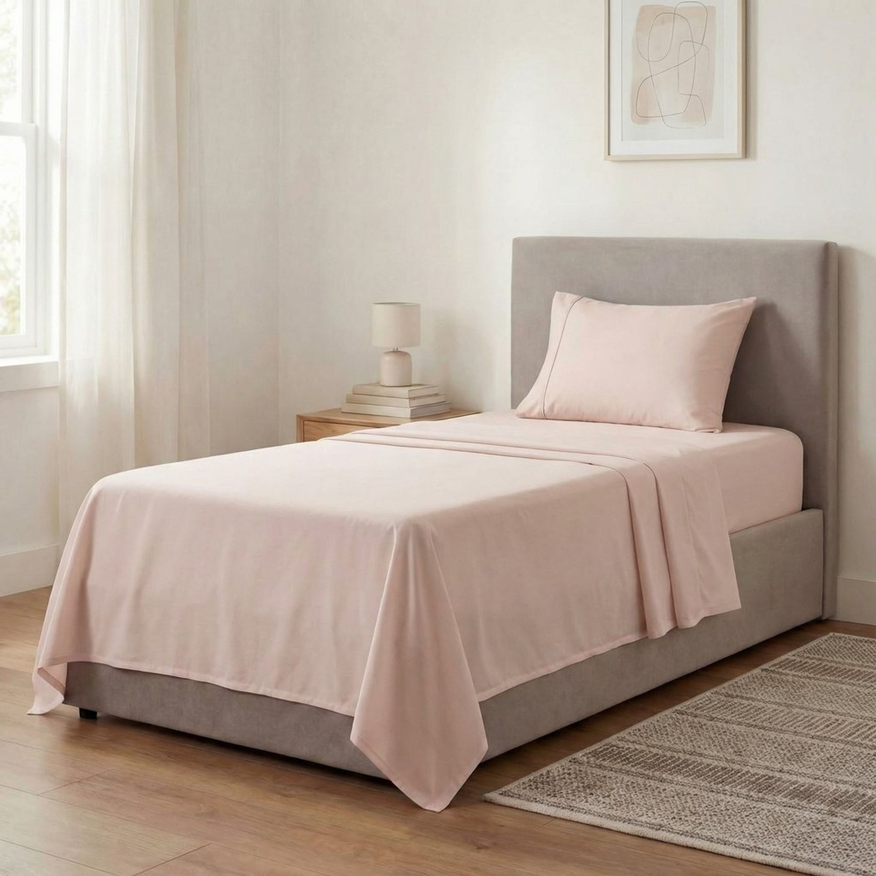 Economia de R$ 14,00O jogo de cama solteiro 3 peças em twill liso na cor rosa claro traz um visual clean e delicado para o quarto. Confeccionado em 100% poliéster, tem toque macio e acabamento com dobra/aba tipo vira, além de costuras discretas que valorizam o caimento e a organização da cama. Marca: Pernambucanas Casa.