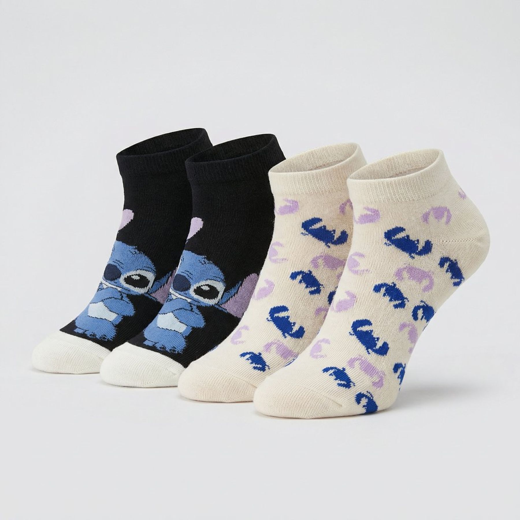Economia de R$ 2,00Kit com 2 pares de meias Disney licenciadas Lilo & Stitch em cano curto, feitas em 100% algodão para toque macio e boa respirabilidade. O punho canelado ajuda no ajuste e o acabamento tem ponta e calcanhar contrastantes. Um par traz o Stitch em destaque e o outro vem em bege com padronagem do personagem em azul e lilás.