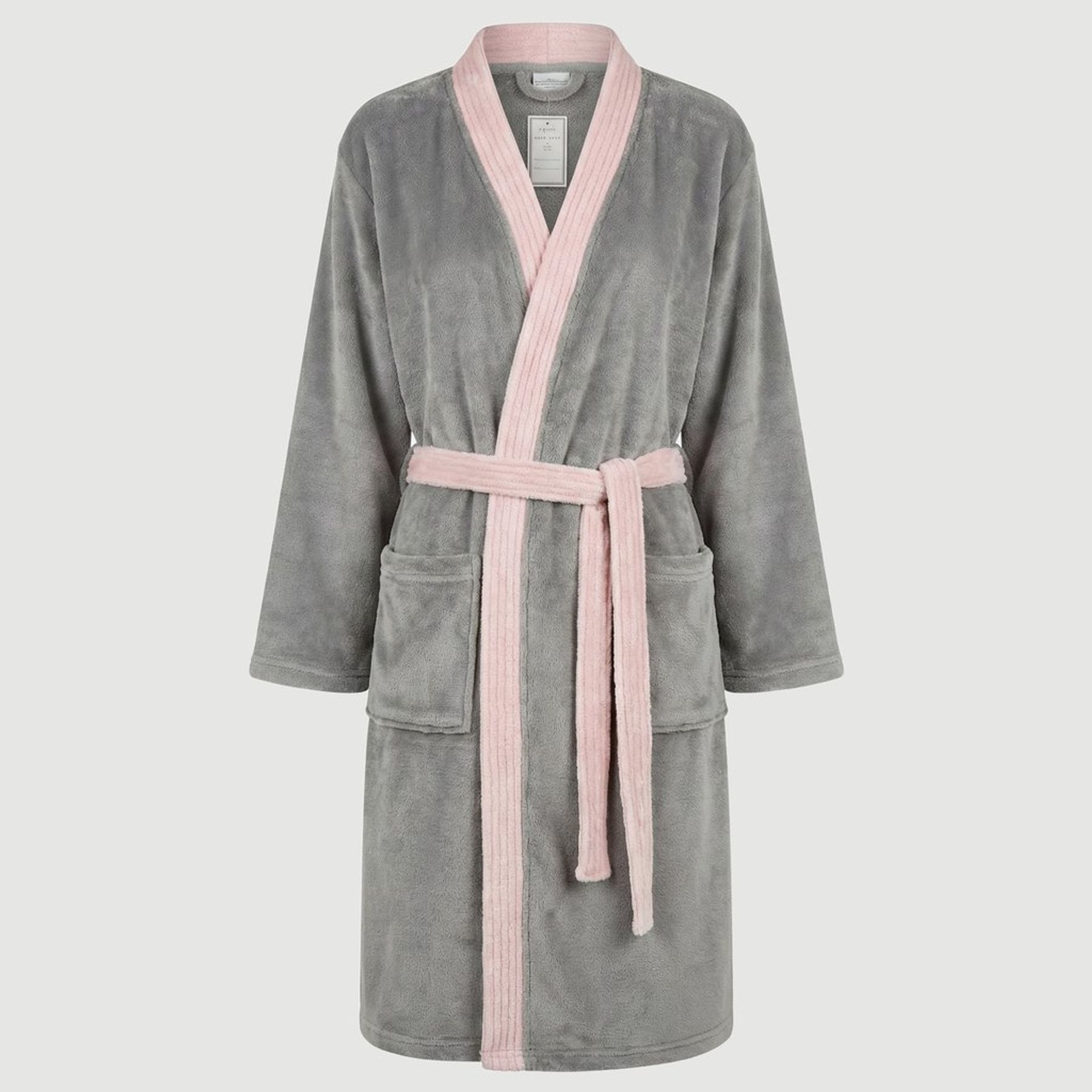 O visual minimalista em cinza é valorizado pelo acabamento contrastante em rosa claro nas bordas e na faixa. Possui mangas longas e 2 bolsos frontais, trazendo funcionalidade para aquecer as mãos ou carregar pequenos itens. Composição: 100% poliéster. Marca: Pernambucanas Casa.