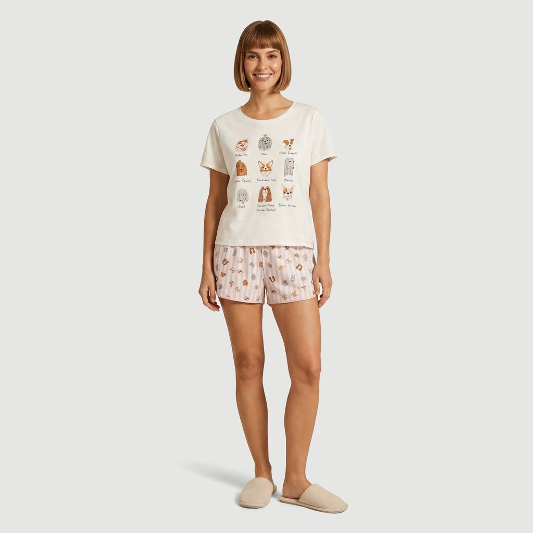 A blusa possui gola redonda, manga curta e estampa frontal com ilustrações de rostos de cachorros e nomes das raças. O short em tom rosa tem listras verticais, mini estampas de cachorrinhos, elástico na cintura e barra arredondada com acabamento contrastante.