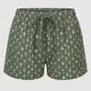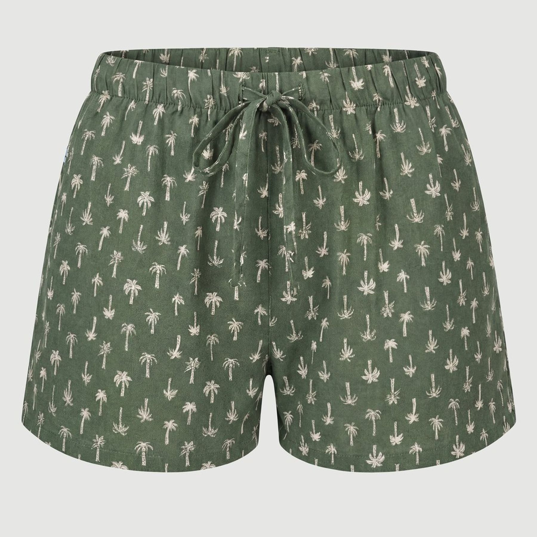 A peça possui cintura com elástico, cós franzido e amarração para ajuste prático ao corpo. A estampa tropical mini de coqueiros claros sobre fundo verde militar completa o look, com barra simples e costura central frontal.