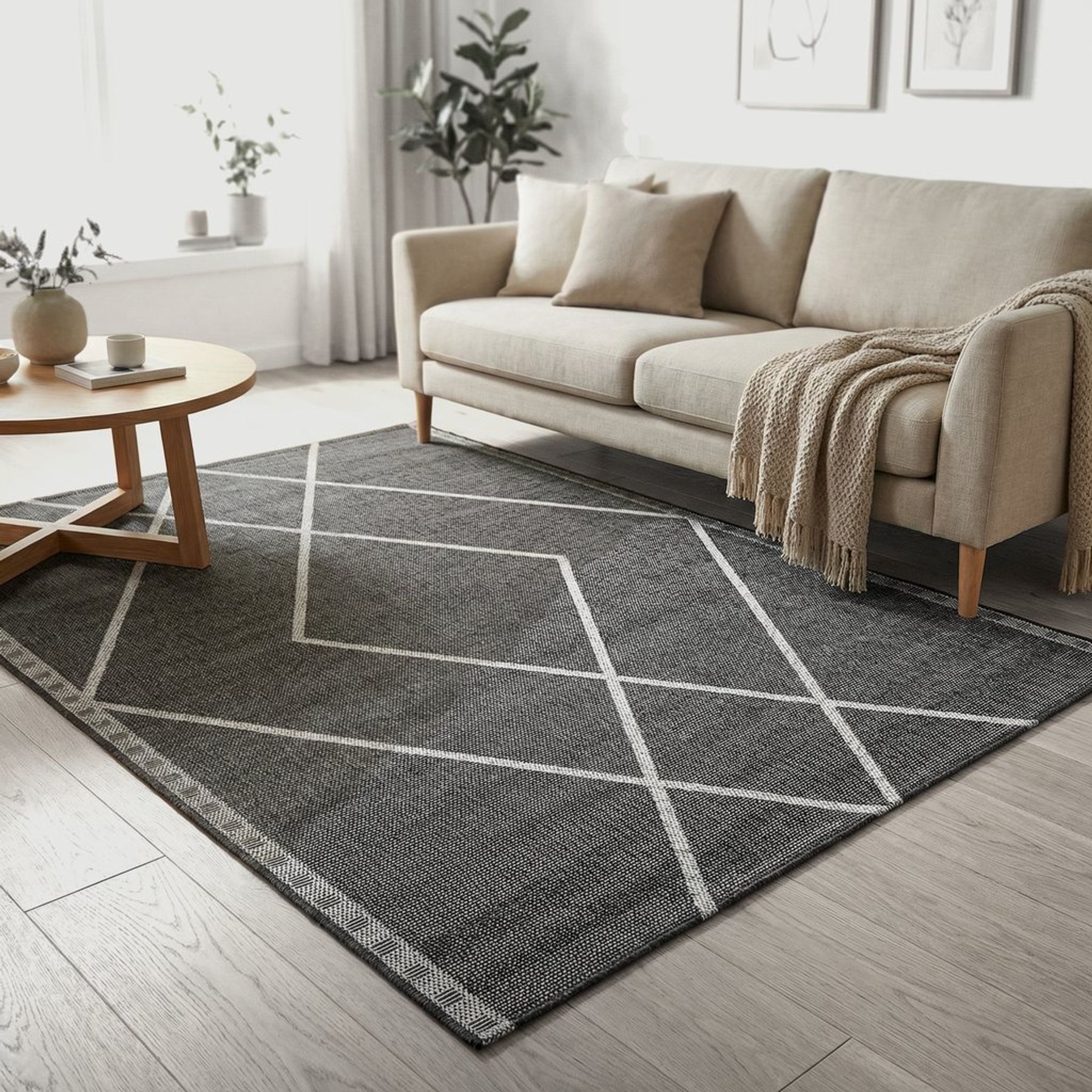 A estampa geométrica de losangos cria um contraste elegante, enquanto a borda contrastante e as faixas laterais com padrão discreto valorizam o acabamento. Conteúdo da embalagem: 1 tapete.