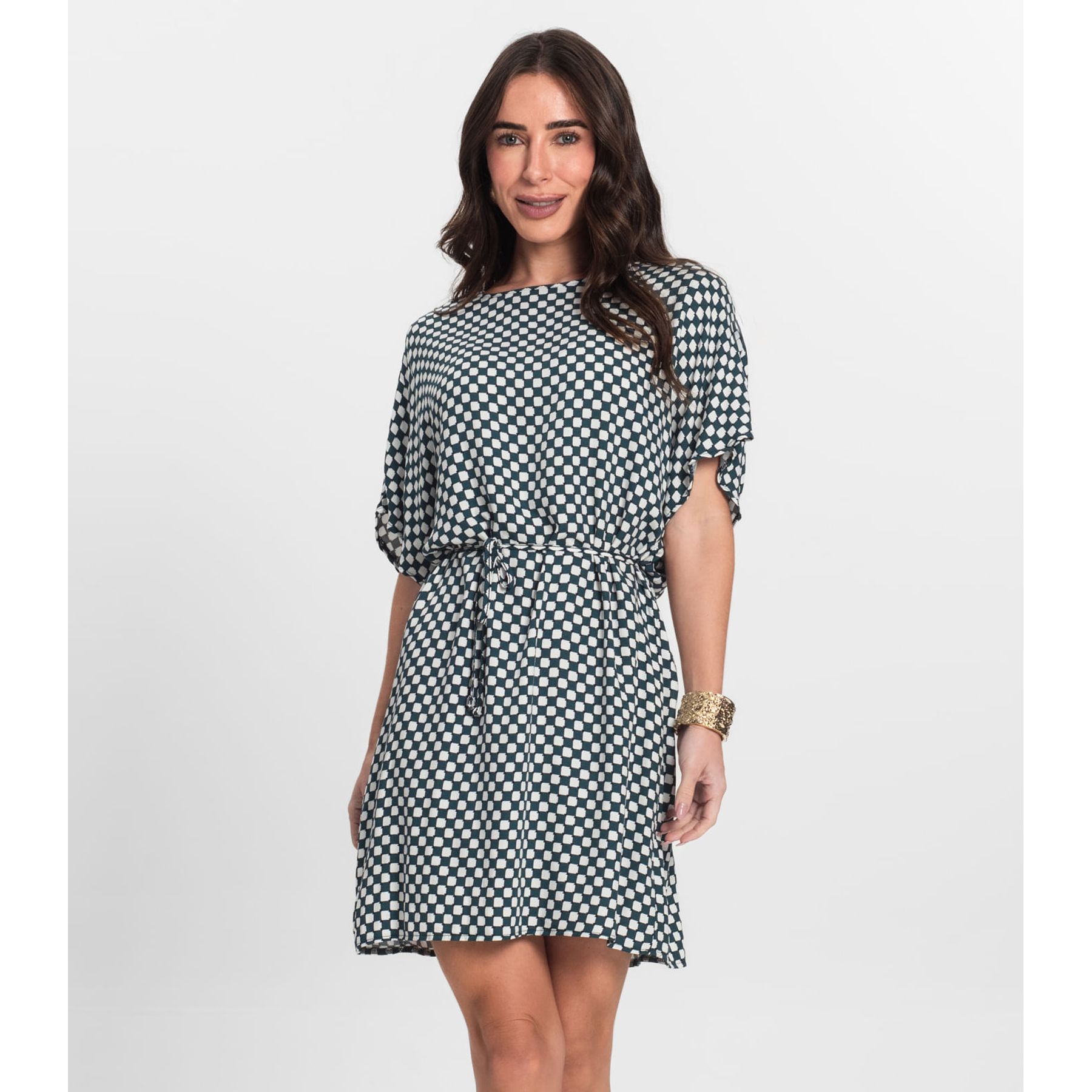 Vestido Feminino Manga Curta com Cinto Estampa Geométrica Preto e Branco - Urbano