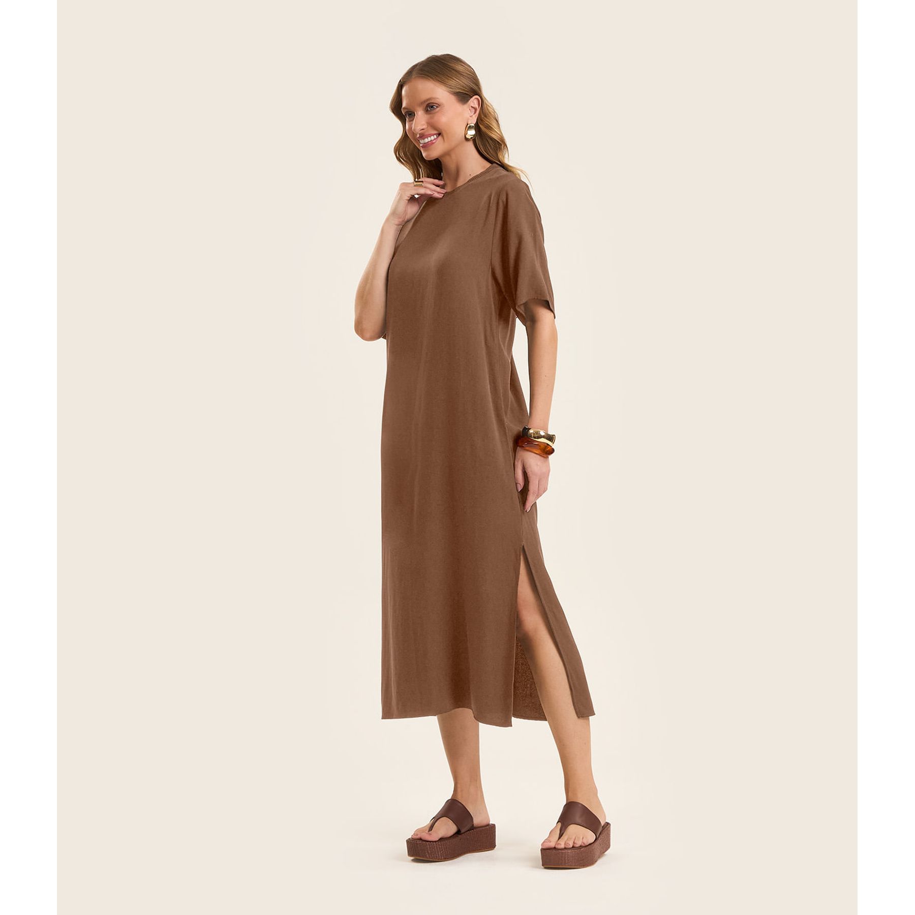 Vestido Midi em Ribana Canelada Rovitex Marrom
